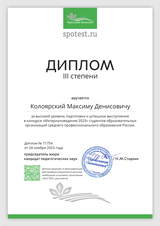 По итогу конкурса дипломами были награждены 30 человек, показавшие наилучшие результаты. В числе победителей конкурса оказался студент гр.33 Колоярский Максим, успешно выполнивший 88% заданий за наименьшее количество времени! Максим награжден Дипломом III степени!