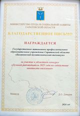БПТ награжден благодарственным письмом Министерства труда и социальной защиты Саратовской области