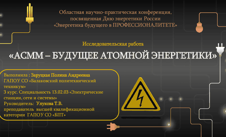 ГАПОУ СО «Балаковский политехнический техникум» в номинации «Инновационные технологии будущего» представляла студентка 3 курса специальности 13.02.03 Электрические станции, сети и системы Заруцкая Полина Андреевна (научный руководитель, преподаватель высшей квалификационной категории Улукова Т.В.) .