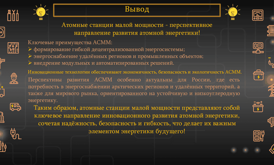 В целях исследования была выбрана тема современных инновационных технологий, определяющих развитие атомной энергетики будущего, и анализ перспективы применения атомных станций малой мощности как одного из ключевых направлений этой отрасли. Полина успешно справилась с поставленными целями и задачами, о чем свидетельствует высокая оценка жюри конкурса (79 баллов из 80 возможных) и присвоение ей Диплома 1 степени.
