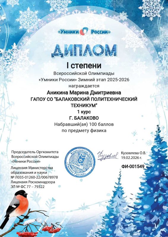 В конце февраля 2026 года были опубликованы итоги дистанционной Всероссийской олимпиады по физике «Умники России» https://school-olympiads.ru/.