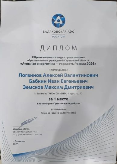 09.04.2026 года в информационном центре Балаковской АЭС в г. Балаково Саратовской области прошла церемония награждения победителей XIII Регионального конкурса «Атомная энергетика – гордость России». Это совместный образовательный проект атомной станции и СГТУ им. Гагарина Ю.А.