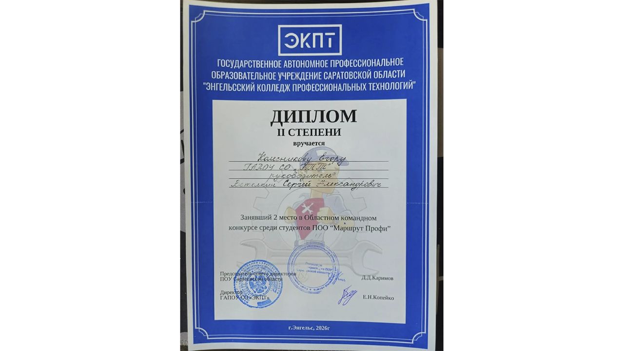 17.04.2026 г. подведены итоги областного конкурса по УГПС 23.00.00 «Техника и технология наземного транспорта» среди студентов ПОО Саратовской области. Организатором Конкурса выступило государственное автономное профессиональное образовательное учреждение Саратовской области «Энгельсский колледж профессиональных технологий». Конкурс проводился в рамках плана работы Совета директоров профессиональных образовательных учреждений Саратовской области на 2025 – 2026 учебный год.
